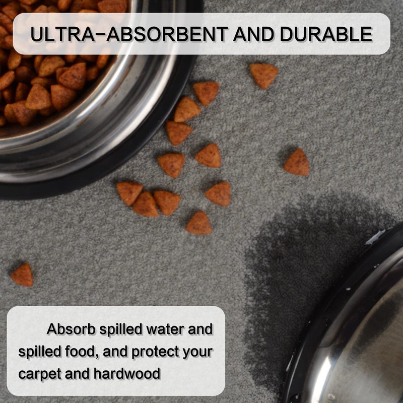 - ULTRA-ABSORBENT AND DURABLE: This dog bowl mats place under your pet's food and water bowl to absorb any water splash, food stains or spills, protecting your carpets and hardwoods; Absorbs up to 4 times its weight in water to help keep floors clean and dry