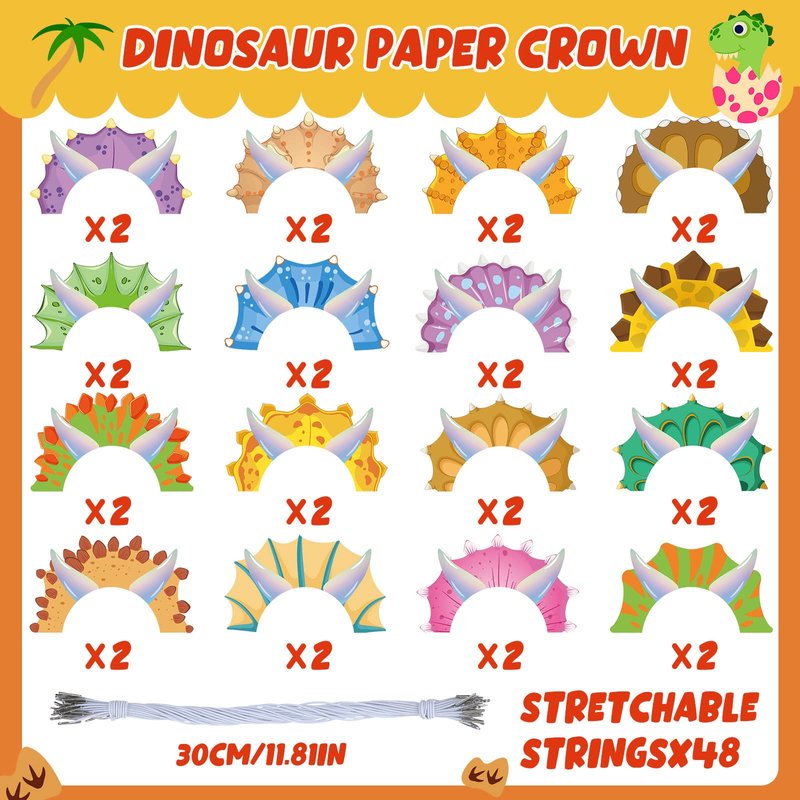- Assorted Dino Hat: you will receive 32 pieces of dinosaur paper hats in 16 styles, 2 pieces for each style, and the package also come with 32 white ropes; Sufficient quantity is enough for your party needs, various styles for you to match your different dress up, adding mote beauty to your celebrations