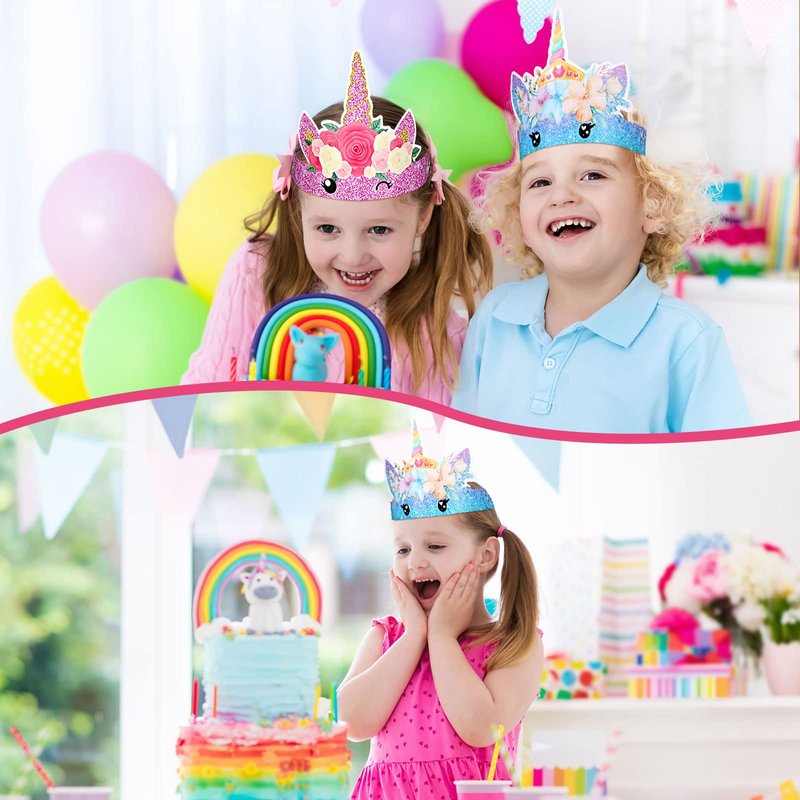 - Add to Your Charm: the party crowns hat is designed into a unicorn shape, colorful, vivid and cute, with pretty flowers embellished, and the surface is glittering, easy to get your kids' favors, making your kids look more attractive at birthday parties