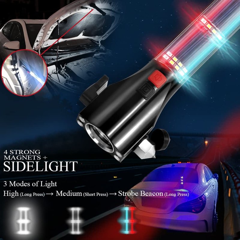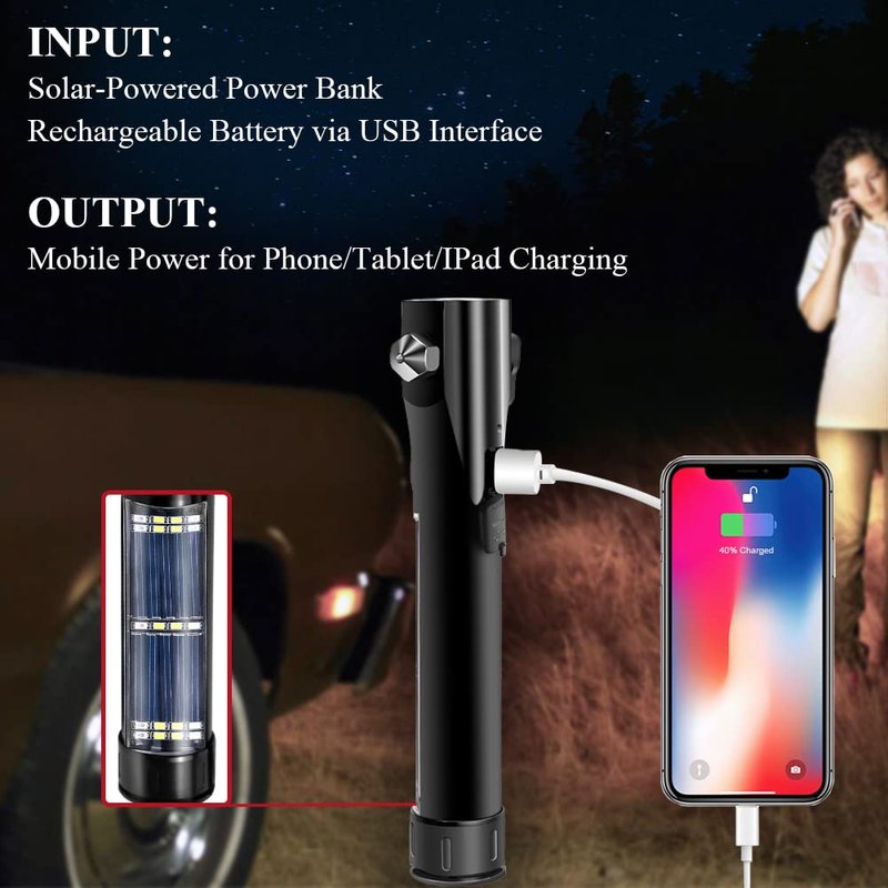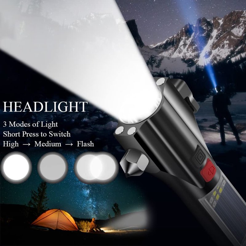 - 16-IN-1 Emergency Kit - Multi-functional kit includes: window breaker, seatbelt cutter, rescue alarm, 3 modes of front light, 2 modes of side light, Strobe SOS Beacon, solar charging, USB charging, mobile power, powerful magnet, enlarged lamp cup, one-button switch, portable design.