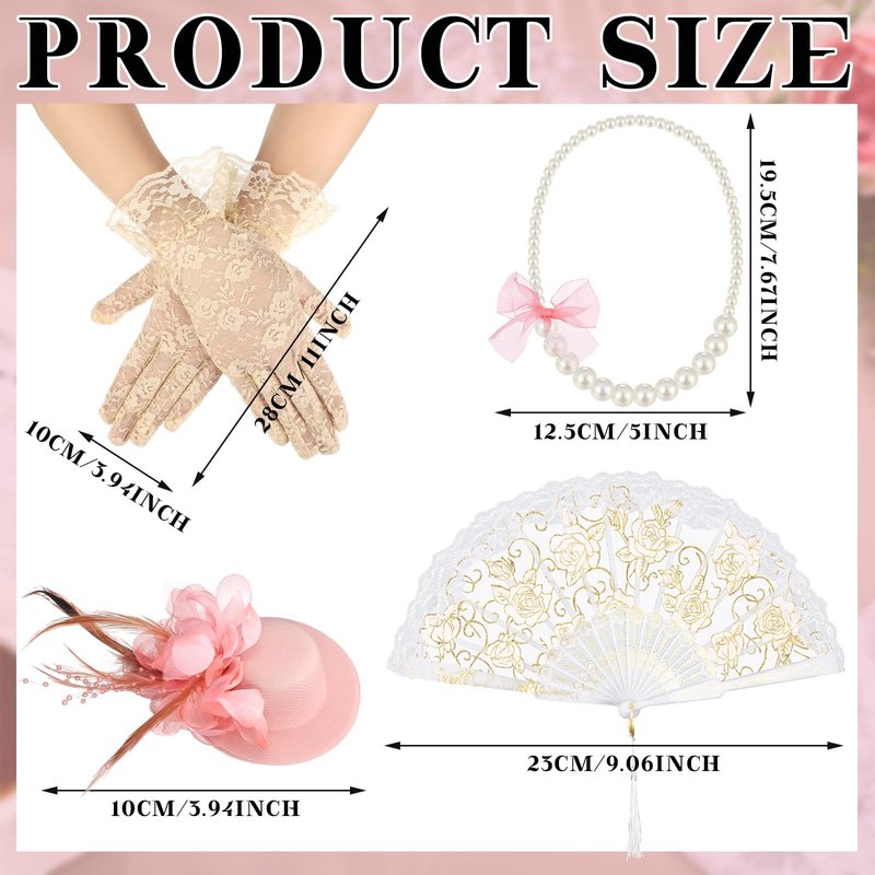 - What You Get: you will get a set of tea party supplies, 1 tea party hat hair accessories, 1 pair of gloves, 1 fan, 1 necklace with a bow, the complete set can meet the party decoration needs