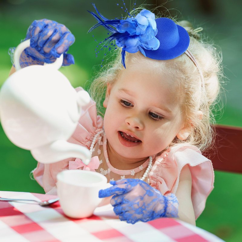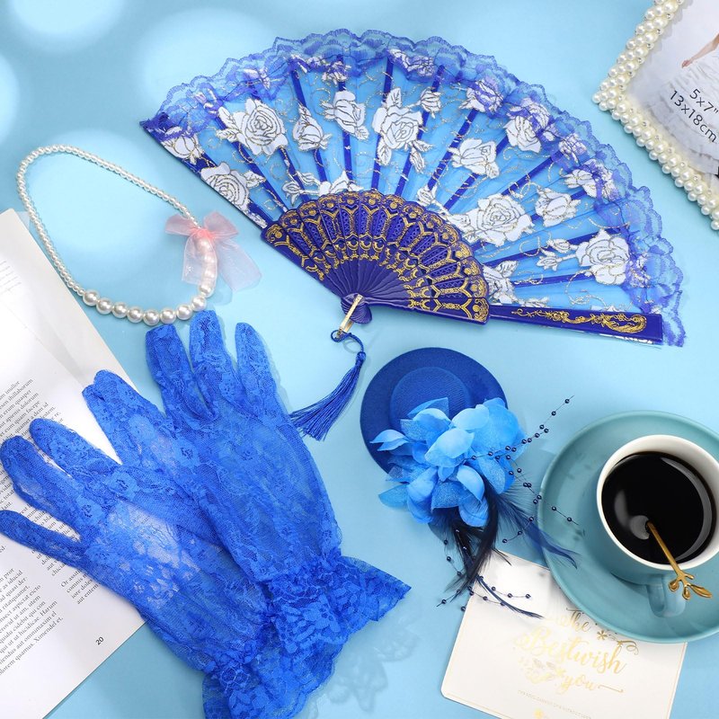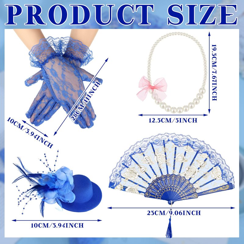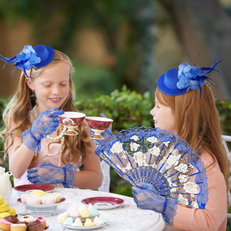 Sintege 4 Pcs Girls Tea Party Supplies Set Tea Party Gloves Hats Girls Tea Party Necklace Fan for Girls Tea Party Favor(Royal Blue)