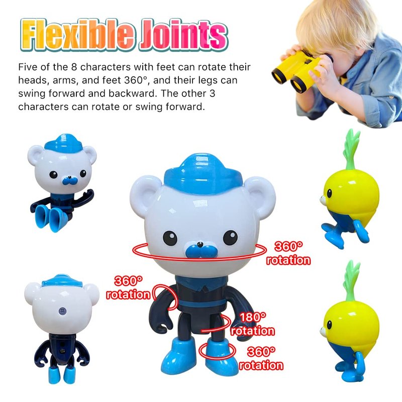 - 🐬【 Flexible Joints and Bright Colors】: Five of the eight characters with feet can rotate their heads, arms and feet 360°, and their legs can swing forward and backward. The other three characters can rotate or swing forward. Flexible joints and bright colors stimulate children's imagination and hands-on coordination