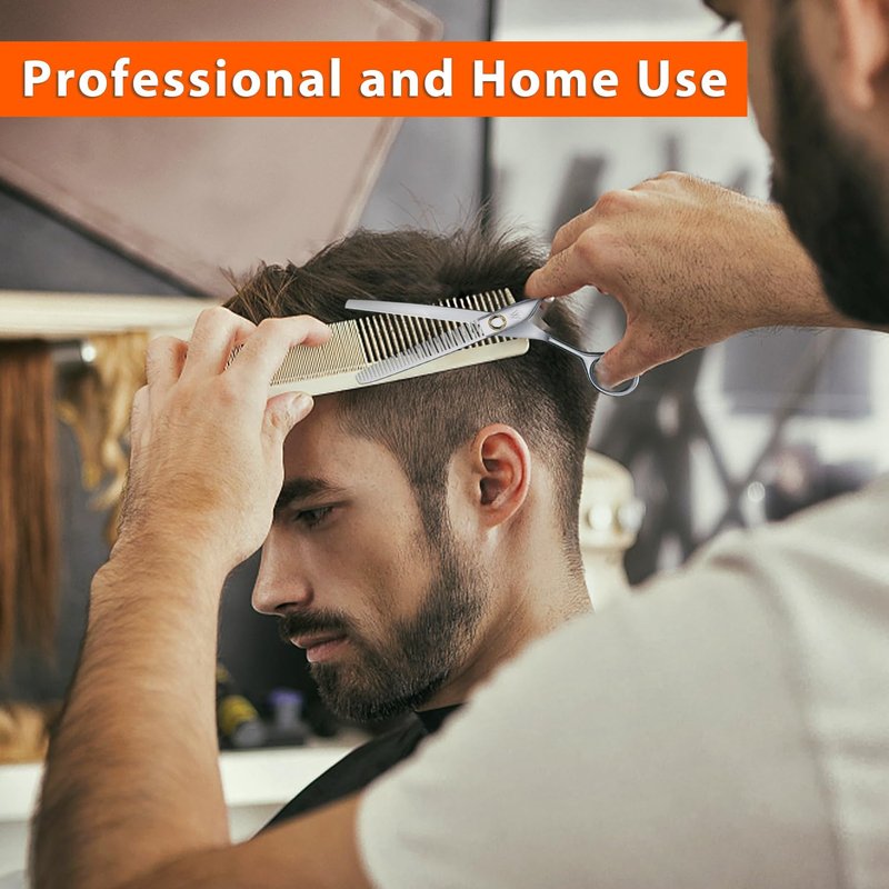 The high-end hair thinning shears are made of 440C stainless steel, with sharp thinning blades for precise cutting. Professional salon barber haircut scissors family use for man woman adults kids.