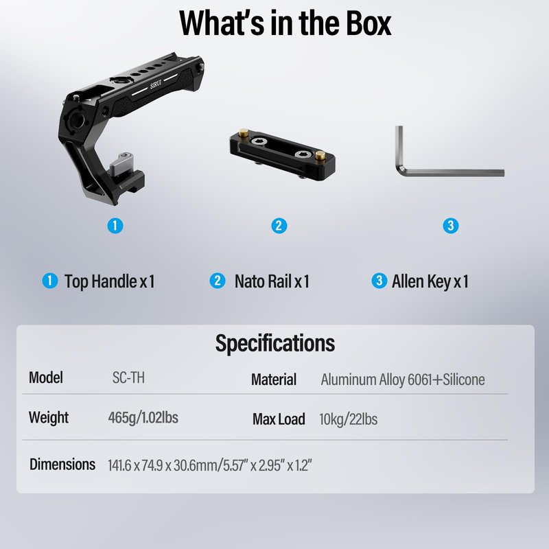 The SIRUI SC-TH NATO top handle, with its lightweight yet robust aluminum alloy construction and ergonomic silicone grip, offers both strength and comfort for photographers and videographers alike. Its tool-free assembly and disassembly through the NATO rail make it exceptionally convenient for rapid setup and low-angle shooting.