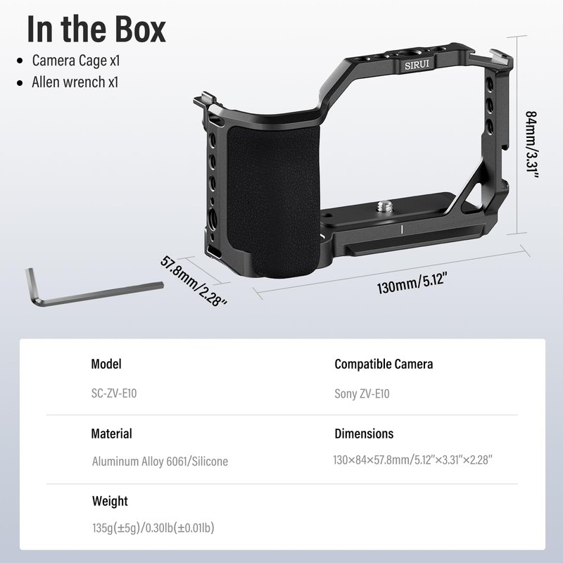 - Designed for Sony ZV-E10: The SIRUI camera cage features an detachable silicone handle designed with ergonomic precision, ensuring a comfortable grip. The bottom of the cage is securely with a 1/4"-20 screw, while the added anti-twist lock on the side provides dual reinforcement for your camera, effectively preventing any unwanted rotation.