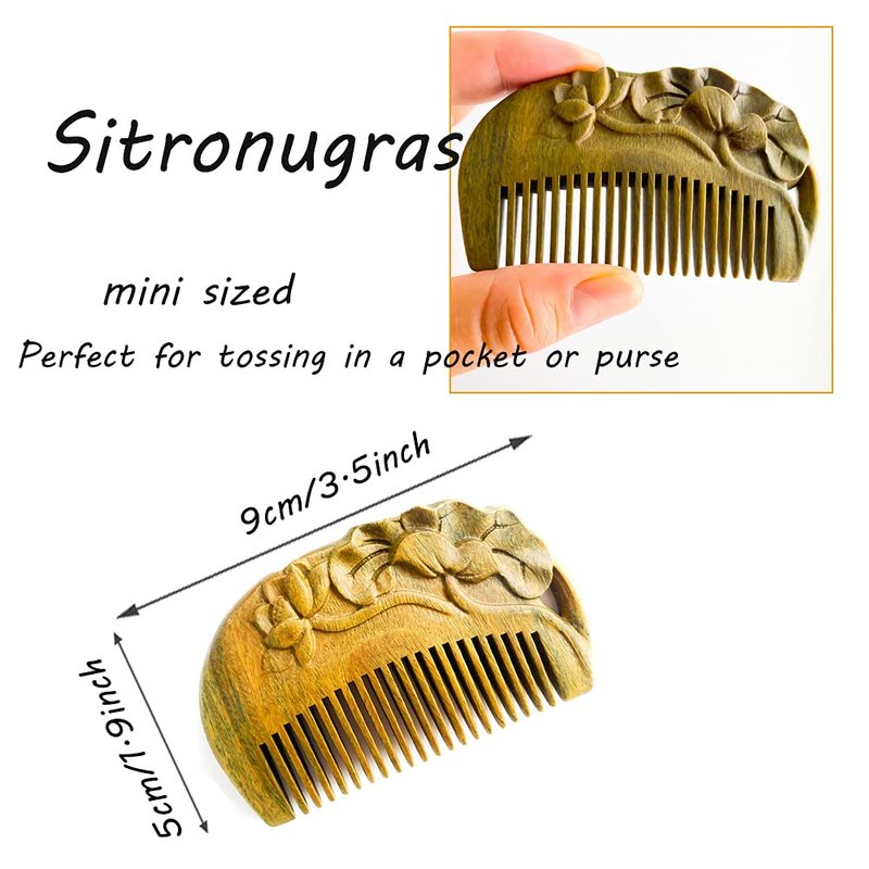 - Material:One piece natural green sandalwood,good quality and nice weight in the hand. will stand up to daily use, travel, and mini sized comb is easy to carry around and can be put into pockets, purses, handbags.