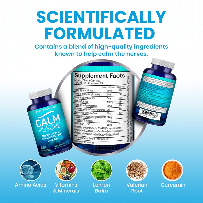 - SCIENTIFICALLY FORMULATED SUPPORT – Calmposure contains a proprietary blend of L-lysine, curcumin, lemon balm, Valerian Root, and L-glycine - this blend, plus other vitamins and minerals, helps promote calmness and relaxation.