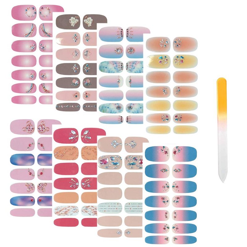 SIUSIO 112pcs 8 Sheets Full Nail Wraps Stick on Gel Nail Polish Strips Stickers Elegant Gradient Glitter Nail Adhesive DIY Nail Art Sticker with 1PCS Crystal Glass Nail Files for Women Girls