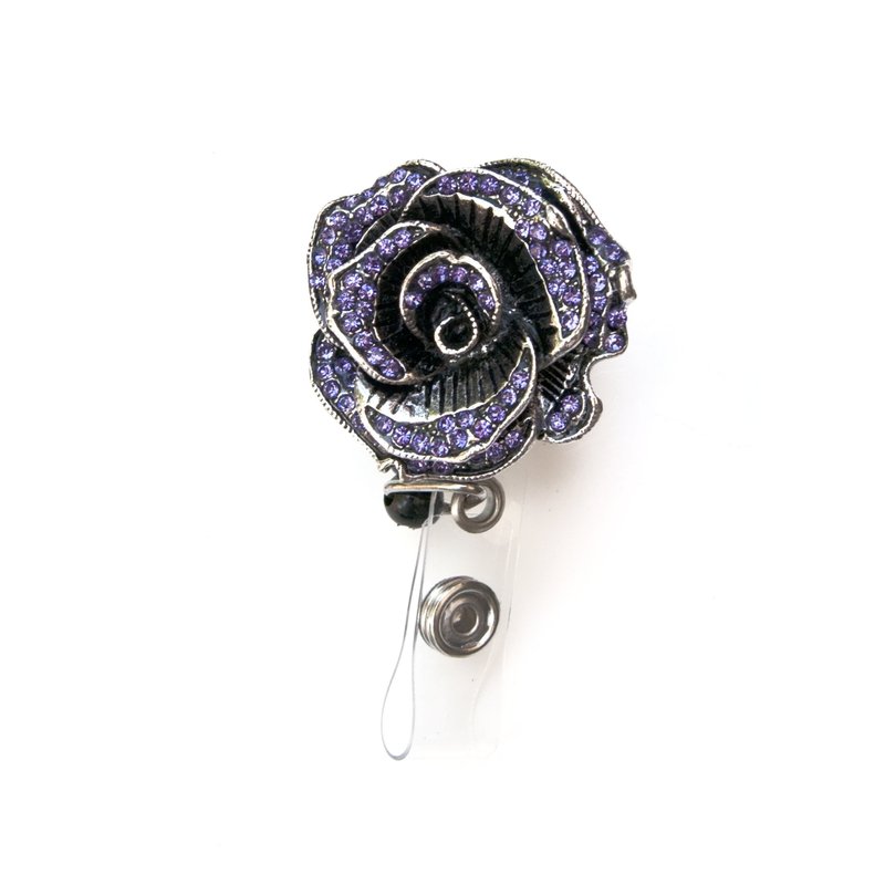 Sizzle City New Colorful Sparkly Rose Rhinestone Retractable Badge Reel/Rhinestone ID Badge Holder (Purple Sparkly Rose)