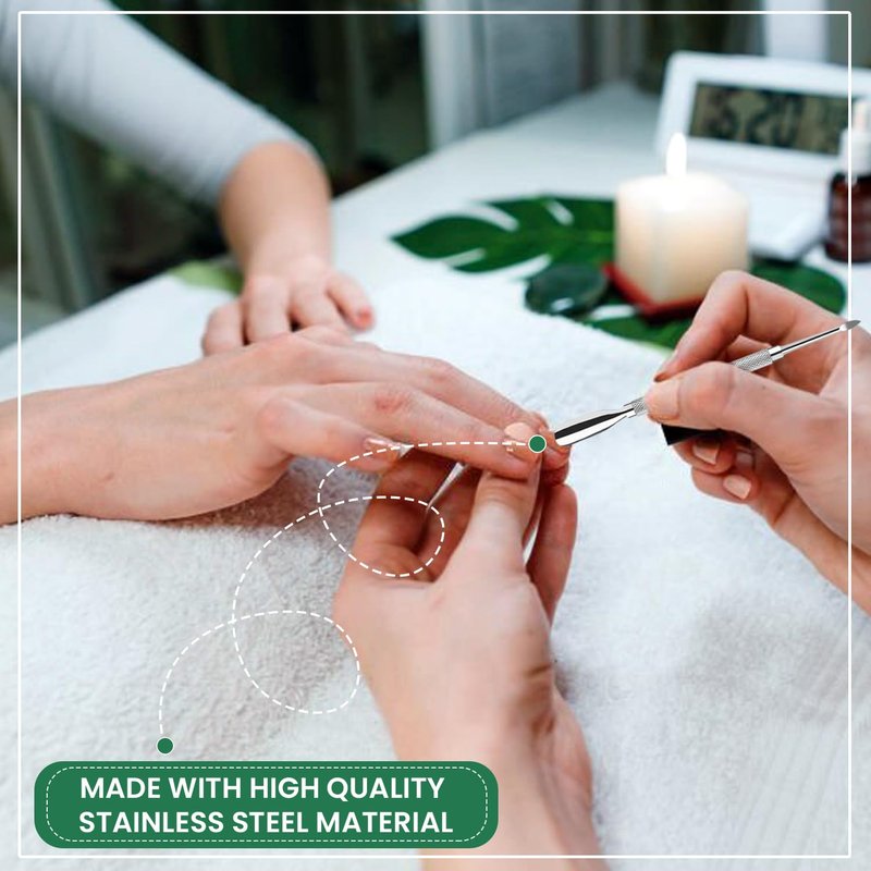 - ✅Double Ended Cuticle Pusher: Our double ended design of the cuticle pusher is easy to use. The curved end conforms to the natural shape of the nail and is great for pushing cuticles and scraping off soaked UV gel and nail polish. The double-curved ends nail pusher act as mirrors for both left and right feet, tiny spoons on their curved tips that effortlessly slip beneath even the tightest fingernails, capturing even the smallest debris particles.