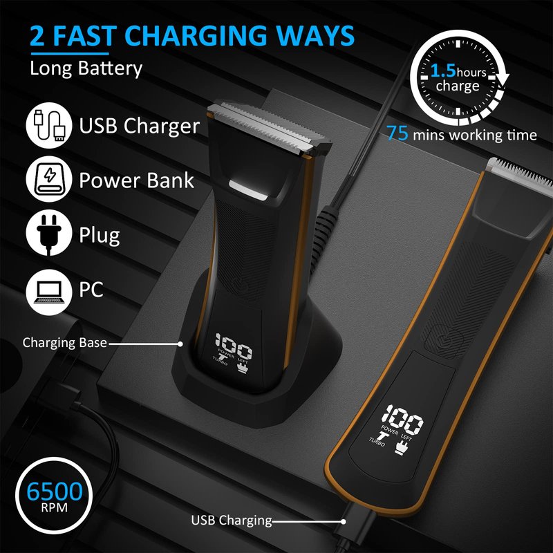 - [USB Fast Charging with LCD Display]1.5 hours charging time and 75 minutes working time. SKERTS rechargeable pubic hair trimmer can be charged not only directly through the shaving machine, but also through the base.The LCD display is designed to facilitate the observation of residual power and timely charging.
