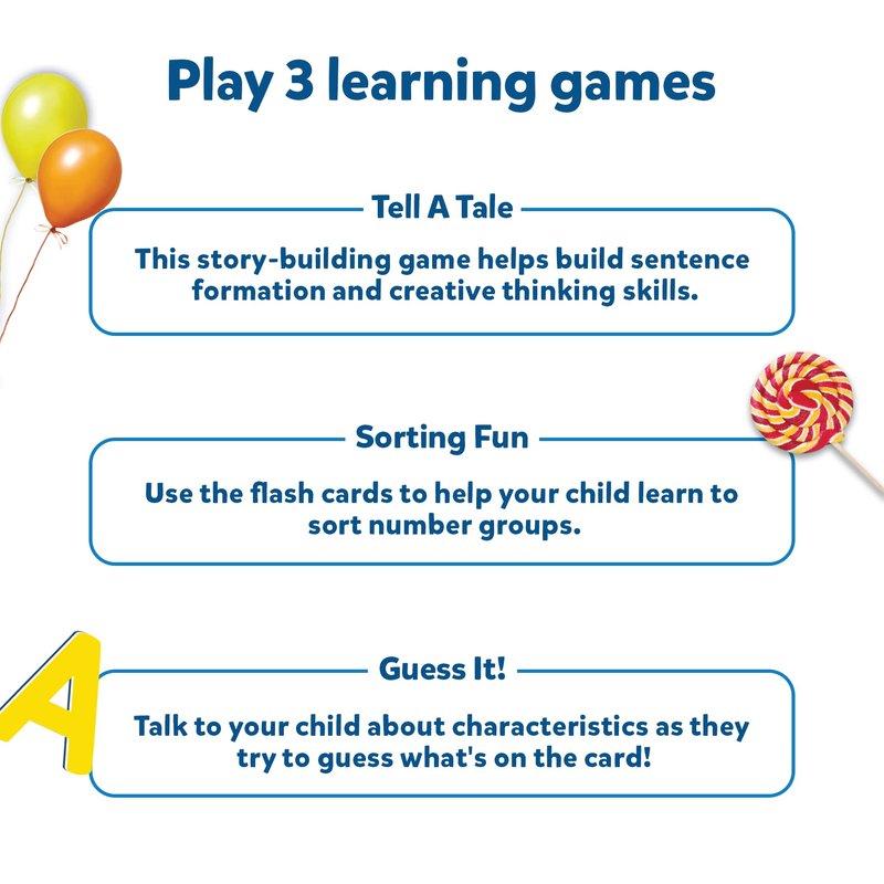 - 3 EDUCATIONAL GAMES & ACTIVITY GUIDE INSIDE: Children learn best through play. Each set of Flash Cards comes with a learning guide with sorting games and activities to extend the learning & play.