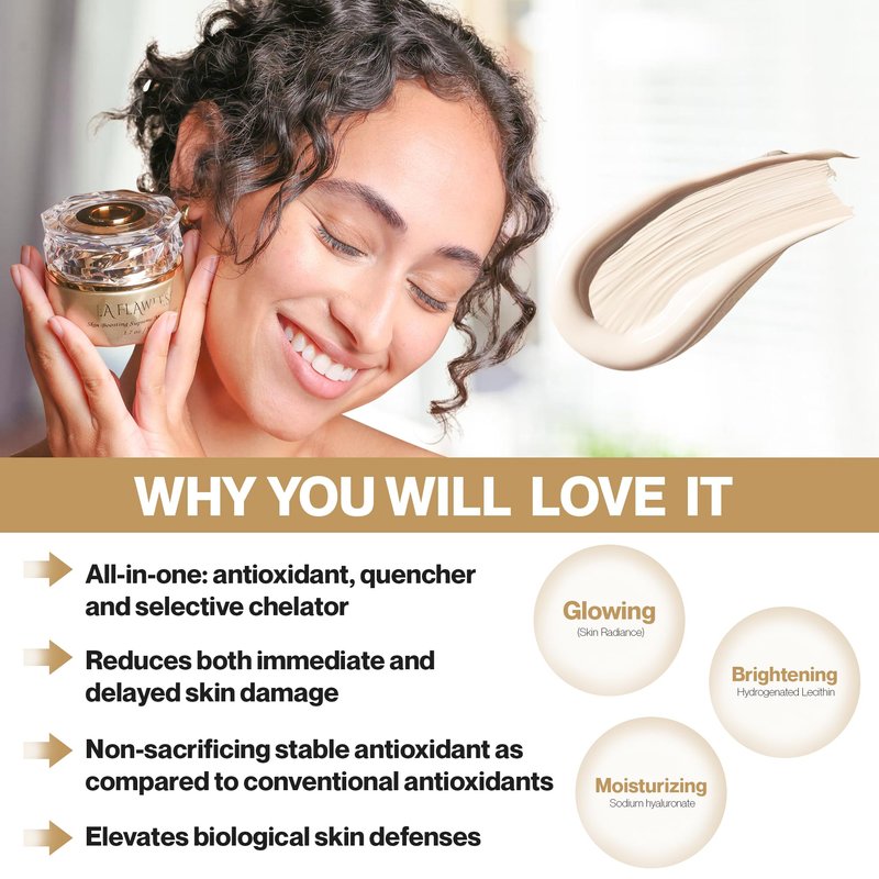 Introducing La Flawless' all-in-one skin perfecting cream - a powerhouse antioxidant, quencher, and selective chelator that works wonders for your complexion. This multi-tasking formula not only reduces immediate and delayed skin damage but also elevates your skin's natural defenses. Unlike conventional antioxidants that can be sacrificed during use, La Flawless' non-sacrificing stable antioxidant remains effective, delivering a radiant glow. With its hydrating sodium hyaluronate, skin-brightening hydrogenated lecithin, and radiance-boosting skin enhancer, this cream is a must-have for achieving a luminous, youthful appearance. Experience the transformative power of this innovative skincare solution today.
