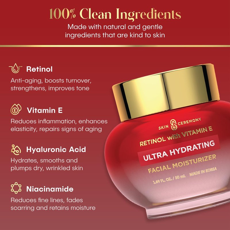 - KOREAN SKINCARE EXCELLENCE: Experience the transformative power of Skin Ceremony's Retinol & Vitamin E Ultra-Hydrating Facial Moisturizer. Made in Korea, this premium product combines cutting-edge Korean skincare with luxurious, effective ingredients.