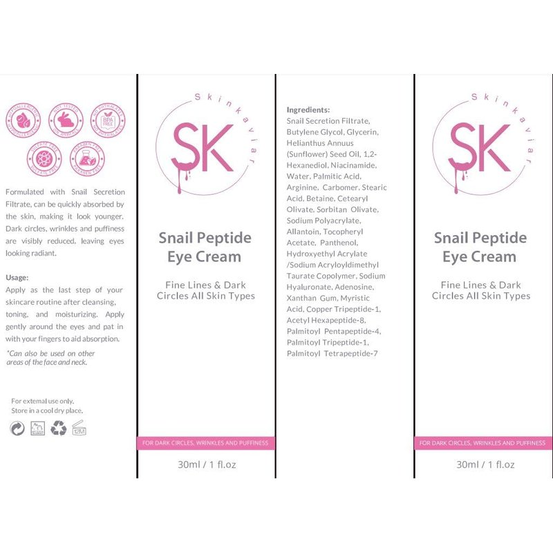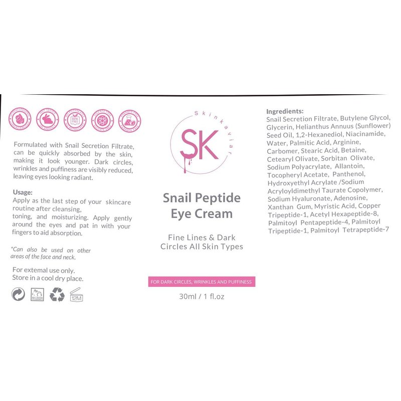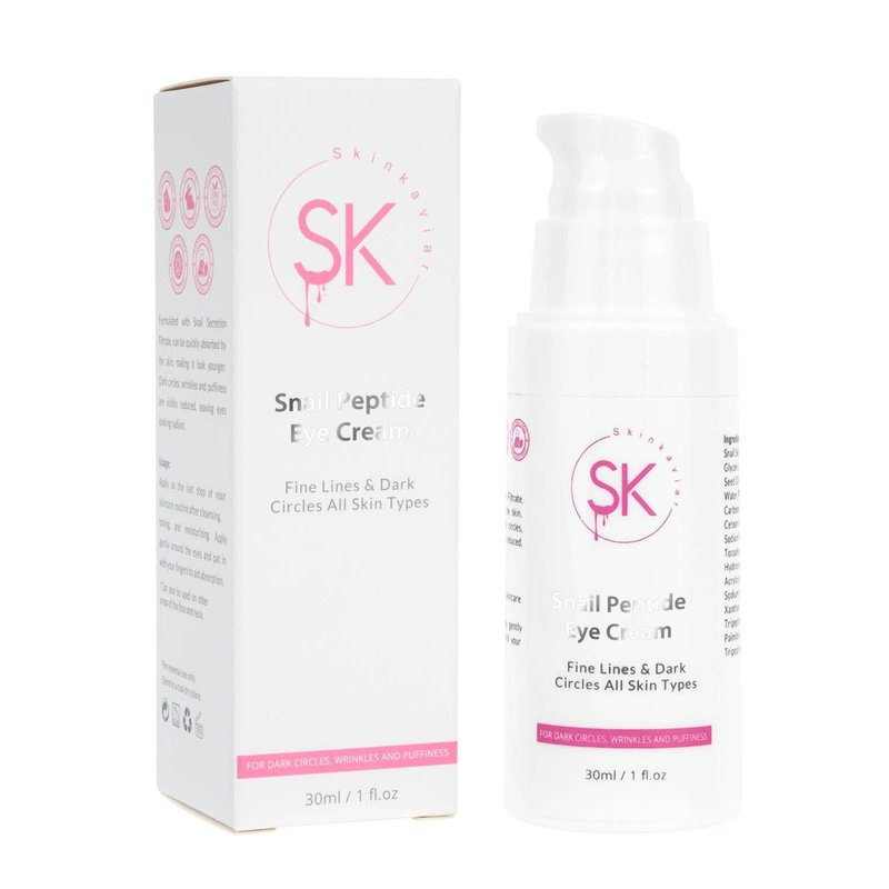 Experience rejuvenated eyes with Skin Kaviar Snail Peptide Eye Cream. Our formula is enriched with snail peptides, known for their skin-revitalizing properties. This luxurious night cream minimizes the appearance of fine lines and wrinkles, reduces the look of dark circles, and brightens the delicate skin around your eyes.
