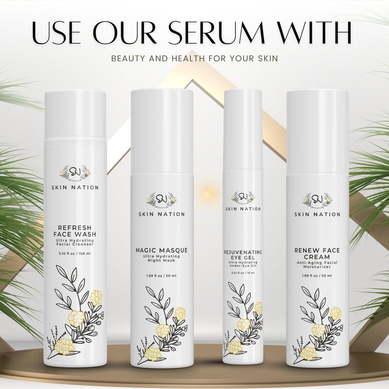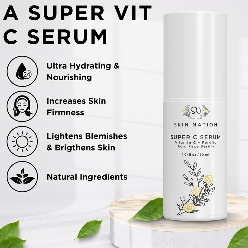Reveal Your Radiant Skin with Skin Nation Super C Serum In the realm of serums for skin care, finding products that truly deliver on their promises can be a challenge. However, our vitamin C face serum is packed with skin-loving ingredients which makes this serum a powerhouse in facial skincare products. Let's dive into the luminous features and benefits that make this face serum a standout choice: Vita C Dark Spot Serum Vitamin C is a well-known skin care superhero. Our vitamin c serum boasts the benefits of vitamin C, making it an ideal addition to your skincare routine. It helps even out your skin tone, reduce dark spots, and protect your skin from environmental stressors. Collagen for Youthful Skin With time, collagen production decreases, leading to sagging and wrinkles. This serum contains collagen, which aids in enhancing your skin's elasticity, reducing the appearance of fine lines and contributing to a smoother, more youthful complexion. Dark Spot Remover and Skin Lightening Cream If you're seeking to fade dark spots and even out your skin tone, Skin Nation Vitamin C Serum for face is your ally. As a skin lightening cream and dark spot remover, it helps diminish the appearance of imperfections and reveals a more radiant complexion. Hydrating and Brightening Serum This hydrating serum provides a one-two punch by offering both. It helps your skin retain moisture and achieve a radiant glow. With glycerin, it ensures your skin stays nourished and revitalized. Anti-Aging Marvel As an anti-aging collagen serum, Skin Nation Super C Serum targets signs of aging, including fine lines and wrinkles. It aids in keeping your skin looking more youthful and rejuvenated. Suitable for All Skin Types This face serum for women and men is versatile and suitable for all skin types, making it an inclusive option for your skincare routine. Whether you're battling dark spots, fine lines, or simply want a brighter complexion, this serum for face is an excellent choice.