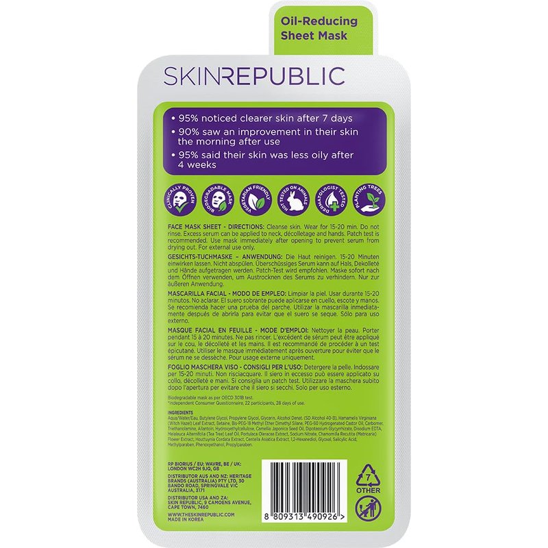 - 95% noticed clearer skin after 7 days. 90% saw an improvement in their skin the morning after use. 95% said their skin was less shiny and oily after 4 weeks. Biodegradable mask. Independent Consumer Questionnaire, 22 participants, 28 days of use. To ensure skin compatibility, it is advisable to test a small area of the skin before use. Use the mask immediately after opening to prevent essence from drying out.