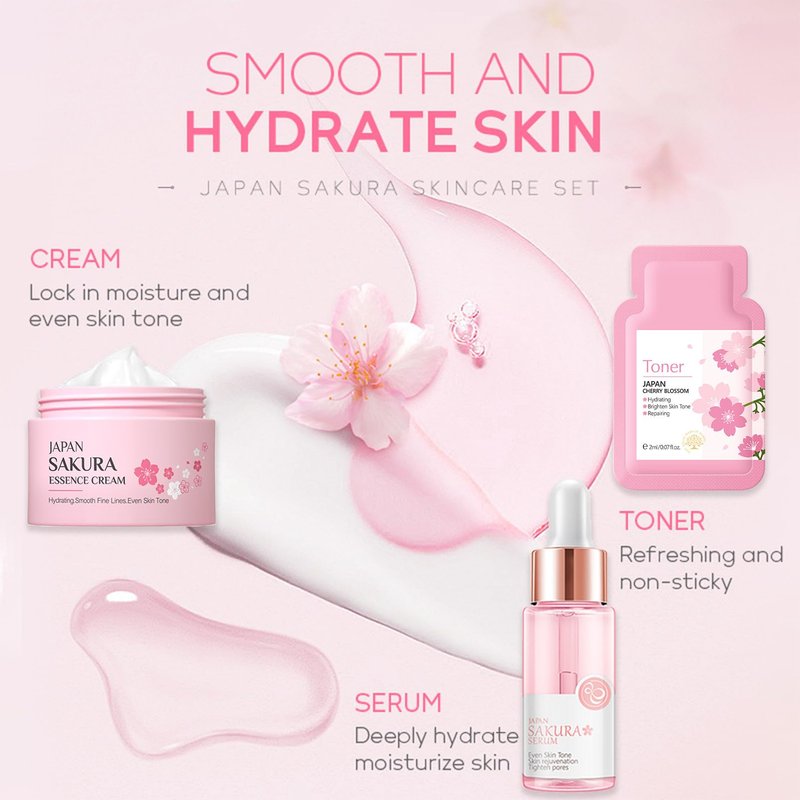 Our skincare set is enriched with cherry blossoms, natural and effective, bringing the ultimate skin care experience.