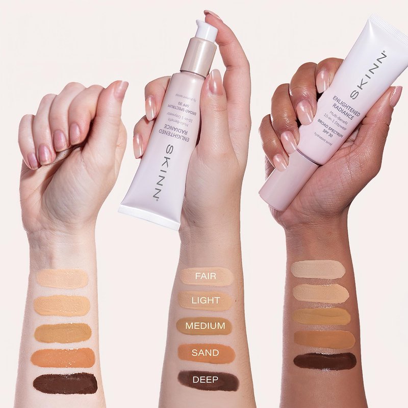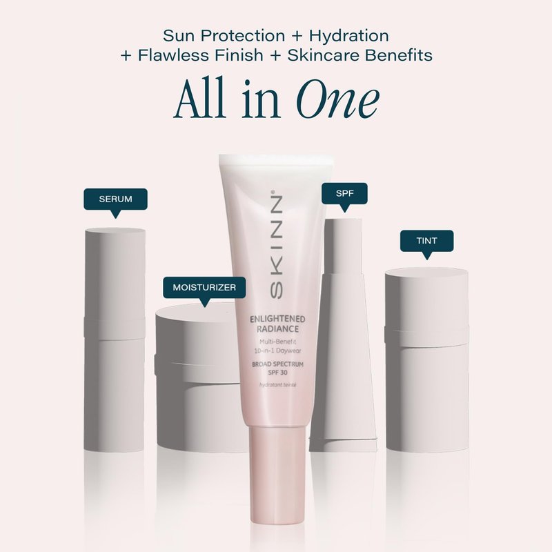 Tinted Sunscreen: SKINN Enlightened Radiance Multi-Benefit 10-in-1 Daywear with Broad Spectrum SPF 30 provides long-wear coverage and helps blur the look of imperfections. Get protection, hydration, glow and ageless skin benefits instantly and long term. Shade: Medium.