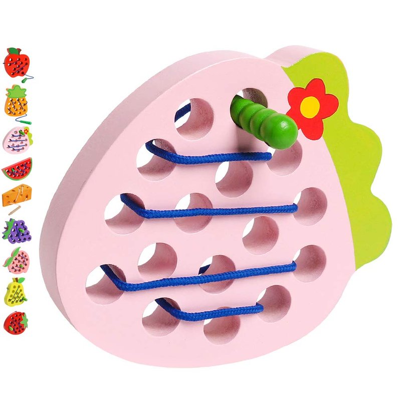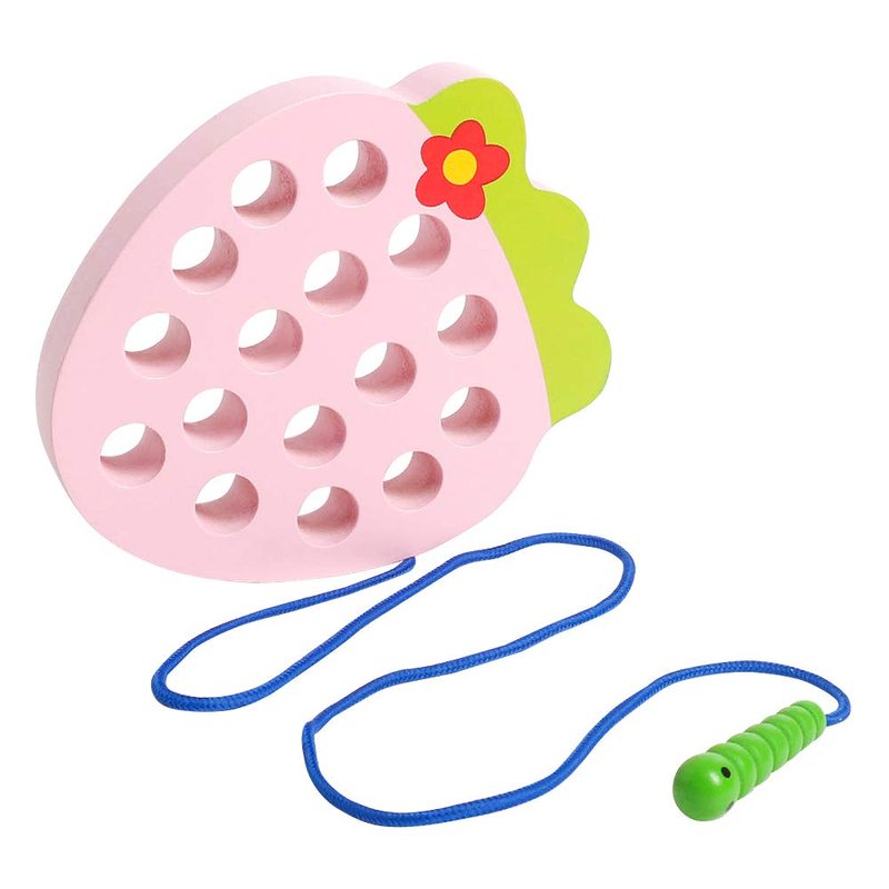 - FUN AND CREATIVE: The Wooden Lacing Strawberry Toy is a simple, vivid pink Strawberry with smooth holes and green leaf look so much delicious, let the hungry caterpillar eat it sooner. Help the string-attached caterpillar munches through the Strawberry by threading in and out. Perfect for training and developing personal skills.