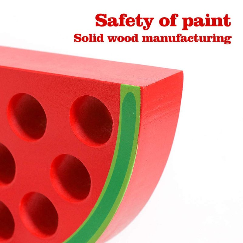 - METERIAL & SIZE: It is made of sturdy and wood construction and paints materials, no sharp edges. The strings are securely attached to the blocks. Watermelon size about 6 x 5.5 inches. Super easy for small hands to hold and play.