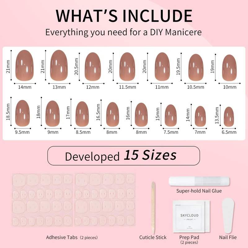 - 👐【 Press on Nails with Design, Natural & Fit Prefectly】SKYCLOUD solid color glossy fake nails are designed according to the radian and thickness of female nails. The thickness of the nail plate is moderate. The tapered cuticle design of the artificial nails fits the nail edge better, the effect is comfortable and natural, and will not cause a great burden on the nail bed. Featuring a glossy finish, this nail set is ideal for mimicking the look of nail polish