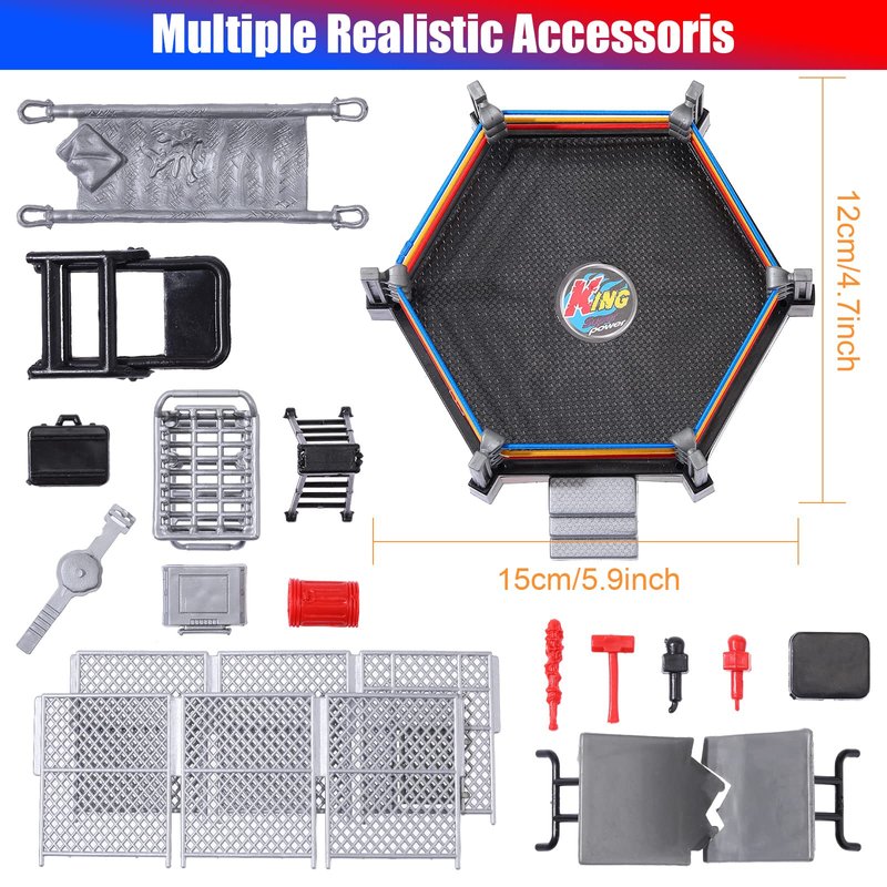 - Props Rich and Realistic Details: wrestler action figures toys are realistic in appearances, every wrestler has clear lines of muscle, and wears underwear, pants and more, looks vivid and mighty, and contained with cage fighting, desk, barricades, stretchers, trash cans, cages, ladders, chairs, briefcases, etc., will add to the overall experience
