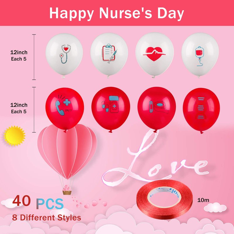 - Sufficient quantity: you will get a roll of red ribbon and 40 pieces latex balloons printed with nurse icons (8 different styles), each style occupies 5, enough to bring you an unforgettable and pleasant nurse theme party