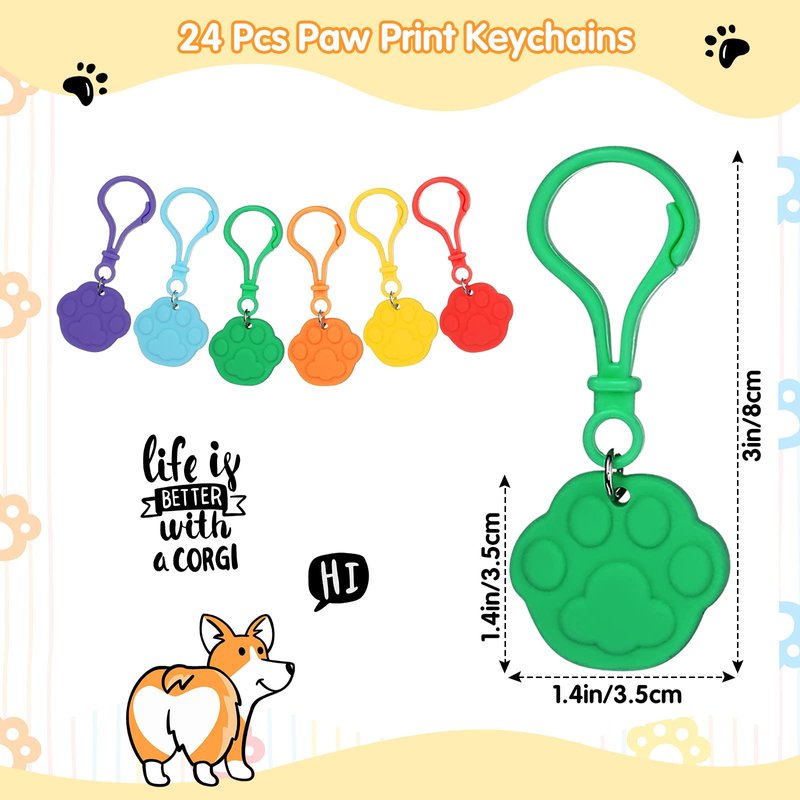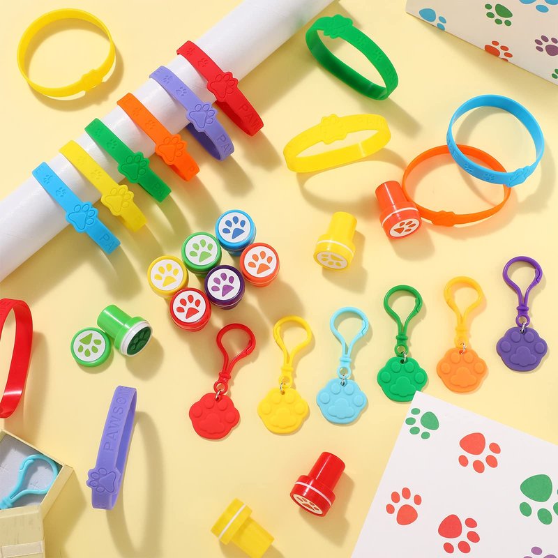 - Dog Paw Party Favors: you will receive 24 pieces of rubber bracelet in 6 colors, 24 paw print stamp, 24 paw print acrylic lobster keychain, a nice combination to meet your different needs