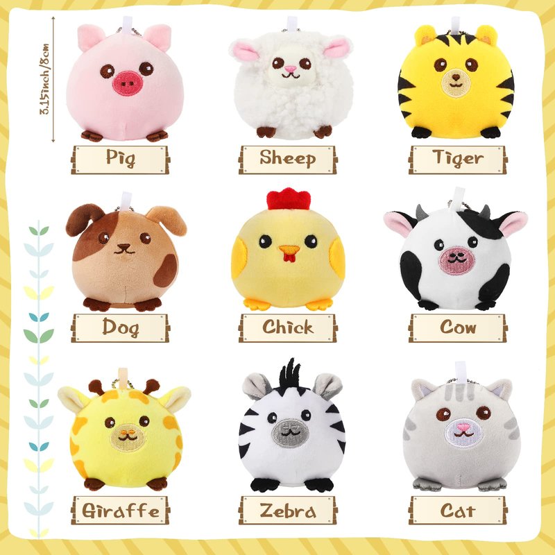 There are 9 stuff animal packs without duplicates, meeting your needs for playing funny games with friends and family. In addition, the plush toys set is also attractive addition for your bag, school bag and keychain.