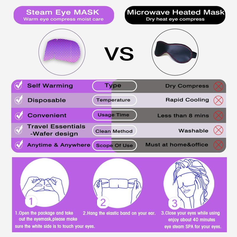 - [Luxuriously Revive Vision] Bask in the serenity of our Steam Eye Mask, delicately infused with the soothing aroma of Lavender. This opulent eye treat enhances sleep by nurturing ocular vitality.Its comforting warmth boosts circulation, banishing puffiness and dark circles. The fine steam combines with meticulous eye care, offering a peaceful spa-like escape.