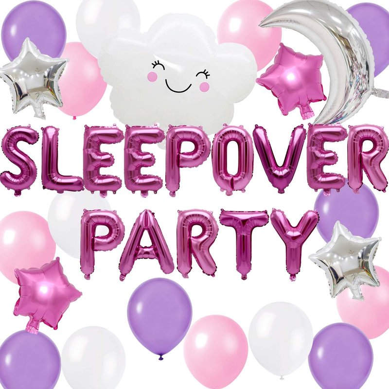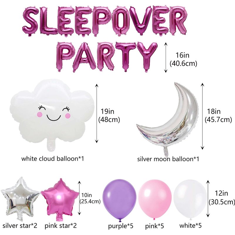 - Package Includes:rose red“SLEEPOVER PARTY” foil balloon *1, silver moon foil balloon *1, white cloud balloon *1, stars foil balloon * 4 (two each in silver and pink), latex balloons *15 (5 each in pink, purple and white), ribbon *1,total 23 packs in one package.