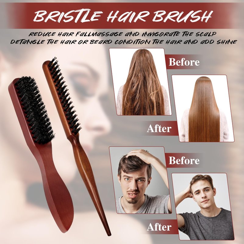 Slick Back Hair Brush, 2 PCS Wood Handle Edge Brush Set Boar Bristle Teasing Brush Rat Tail Comb Small Portable Travel Hair Brush for Women Thin & Fine Hair Smoothing, Sectioning, Beard Brush for Men