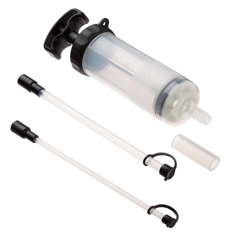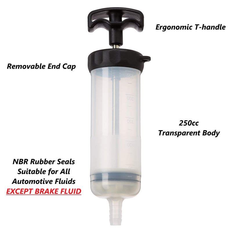 Slippery Pete is excited to add this item to it's line of automotive transfer pumps. This fluid extractor is for Automotive Fluids such as ATF, Engine Oil, Power Steering Fluid and Coolant. This pump uses NBR rubber seals, which is NOT SUITABLE for Brake Fluid. For Brake Fluid extraction, please use Slippery Pete's 250cc Brake Fluid Extractor (EPDM Seals) This pump comes with 2 sizes of suction tubes: 6mm and 10mm OD, which have a tethered drip cap to prevent leaking of residual fluid.