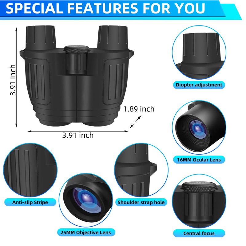 - 【Lightweight, Waterproof, Pocket Binoculars Design】:Pocket binoculars body IPX67 waterproof and anti-fog, made of shockproof PVC+ABS material, weighs only 0.5 pounds and can be folded to the size of your palm. Kids can also use them easily, compact design makes them easy to store in your pocket or backpack.