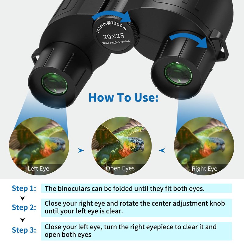 - 【Easy Focus, Low Light Vision, Suitable for Eyeglasses】:Dual focus wheel design, stable and fast 3 seconds focus. The surface is coated with multiple layers to provide brighter and clearer vision even in low light conditions (e.g. dusk). Long eye relief combined with large eyepieces allows you to still see distant objects clearly when wearing sunglasses or glasses, or when using without glasses.Compact binoculars feature 16mm large eyepieces for clearer images than other travel binoculars.