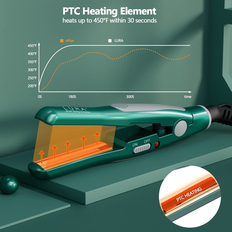 - 【Heat Up Quickly】LURA mini hair straightener with PTC heating element can be heated up to 450°F within 30 seconds and provides stable temperature, which greatly improves the styling efficiency and reduces thermal damage