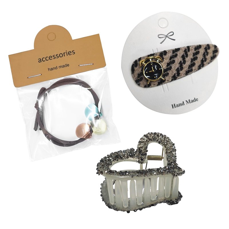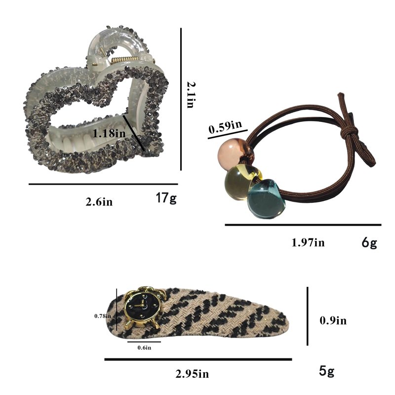 This hair accessory set is perfect for daily styling, featuring a rhinestone heart claw clip, a classic hair clip, and an elastic hair tie with colorful balls. Ideal for thin hair, these small clips hold your hair securely while adding a touch of bling. Designed for women who want both style and functionality in their hair accessories, this set covers all your daily needs.