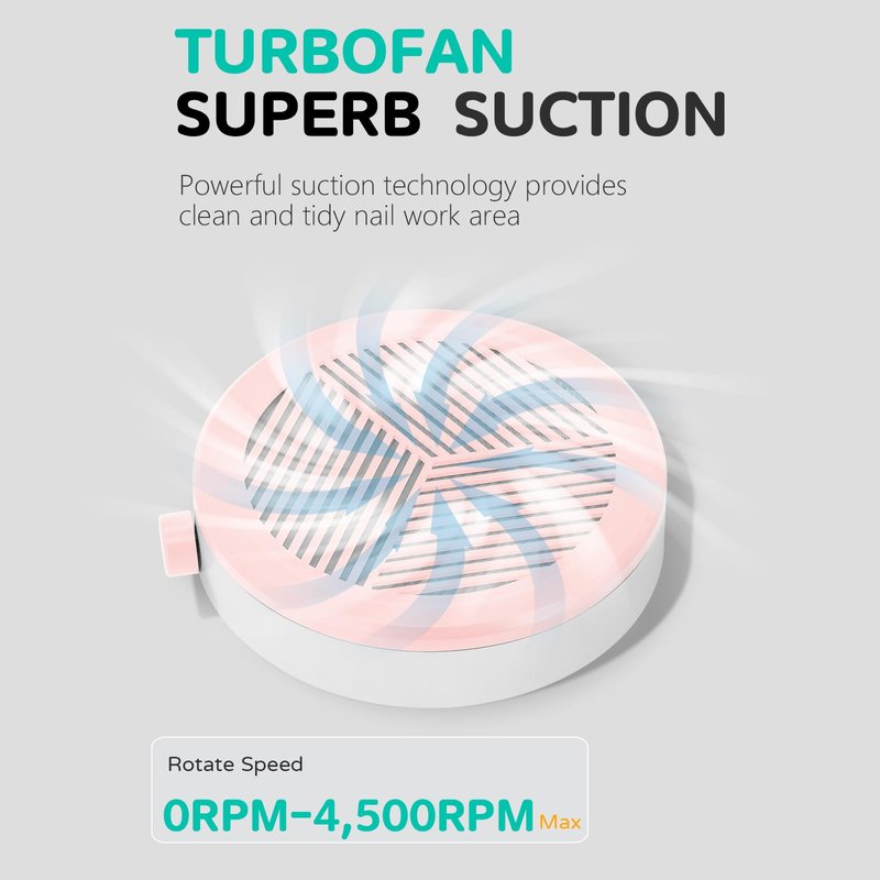 - POWERFUL SUCTION: The NDC9 nail dust collector features an advanced turbo fan that spins up to 4500 RPM. When performing nail polishing nail surfaces or other nail art processes, the NDC9 nail dust collector can quickly collect this nail dust and keep the work area clean.