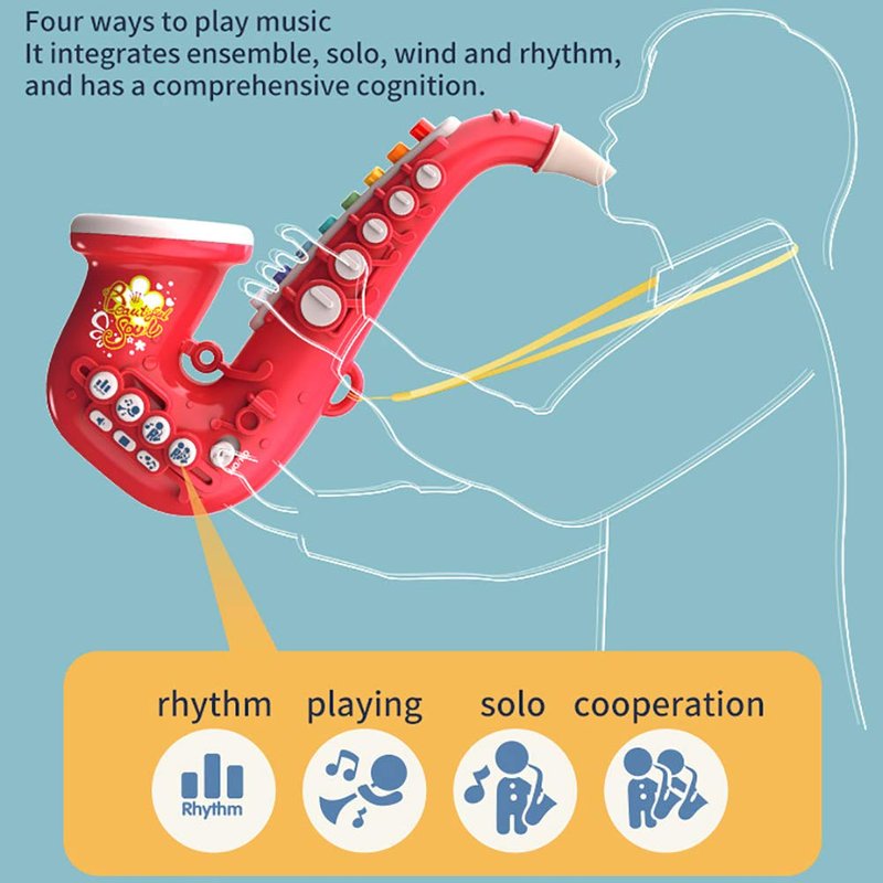 - 【Multifunctional Saxophone Toy for Kids】4 modes to play this kids saxophone toy,8 scales music keys,10 music tracks,10 nursery rhythms,6 rhythms,5 adjustable volume levels.