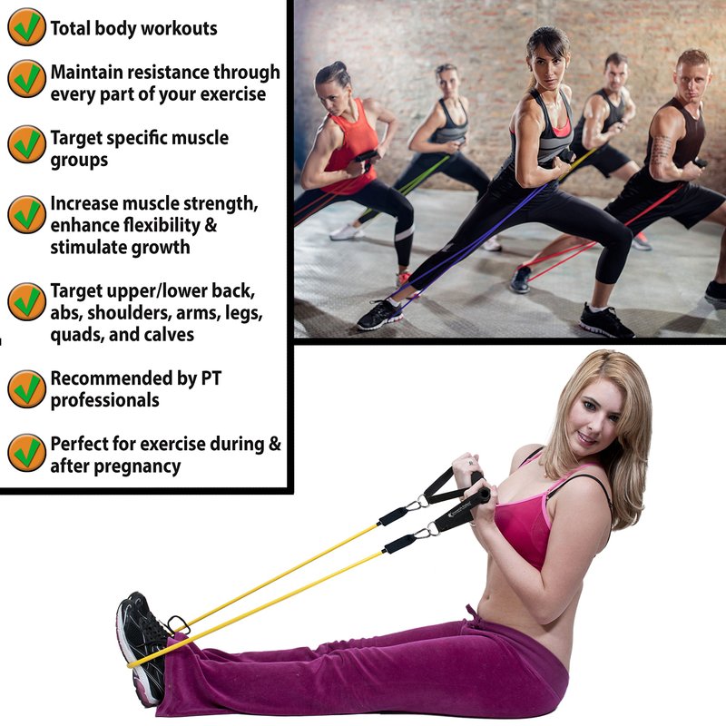 - Safe, Heavy Duty Anti Snap Elastic Tubes: Measuring 39 ½ inches long, each band is made of reinforced elastic tubing with stainless steel carabiners and double-stitched ankle straps that prevent tearing or snapping even under extreme stretch resistance.