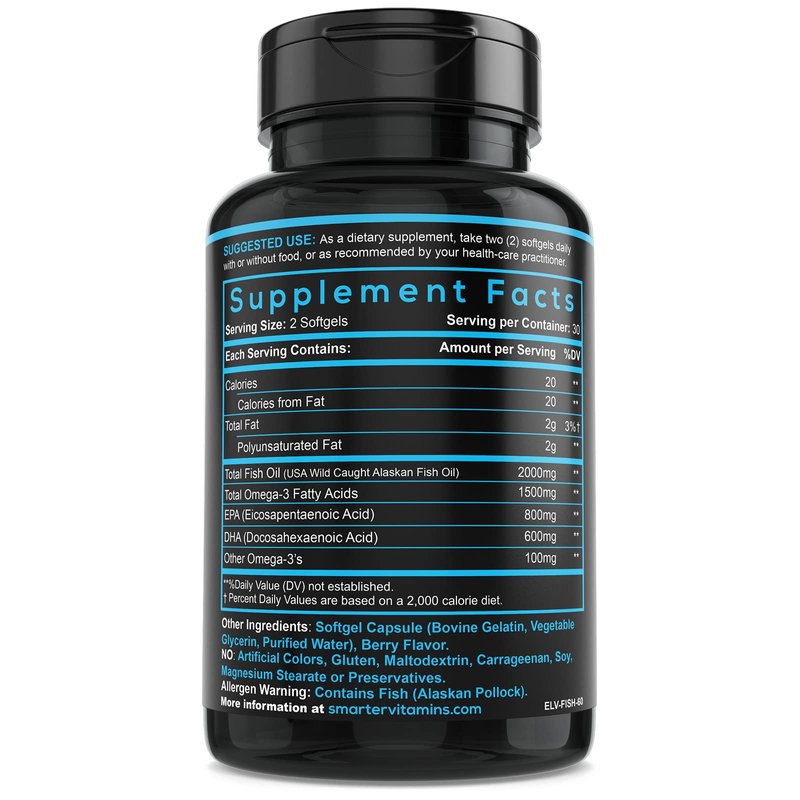 SmarterVitamins Omega 3 2000 mg per serving 1500 mg Omega 3's per serving Fish Oil is formulated with AlaskOmega Fish Oil. Strawberry Flavored. Fish 1000 mg Softgels.