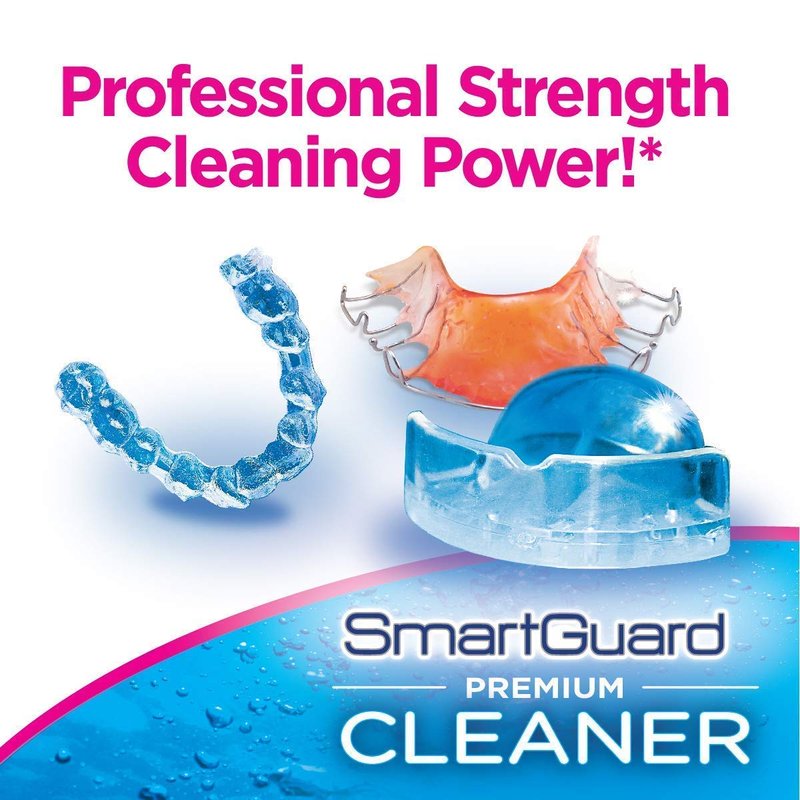 - 2. CLEAR BRACES: When tested by soaking clear retainer braces in the SmartGuard cleaning crystals for 336 hours straight, the new brite clean clear retainer did not burn or turn the plastic retainer cloudy or leave a residue on clear retainer tray. WARNING...Do Not do this with other cleaners. Protect your expensive investment and clean with SmartGuard.