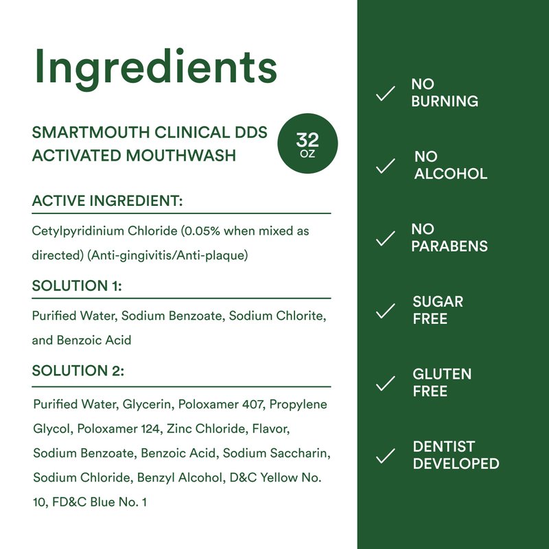 • Clinical Mouthwash Without Alcohol: SmartMouth mouthwash is alcohol-free and paraben-free, providing a comfortable rinse without any stinging or burning sensations