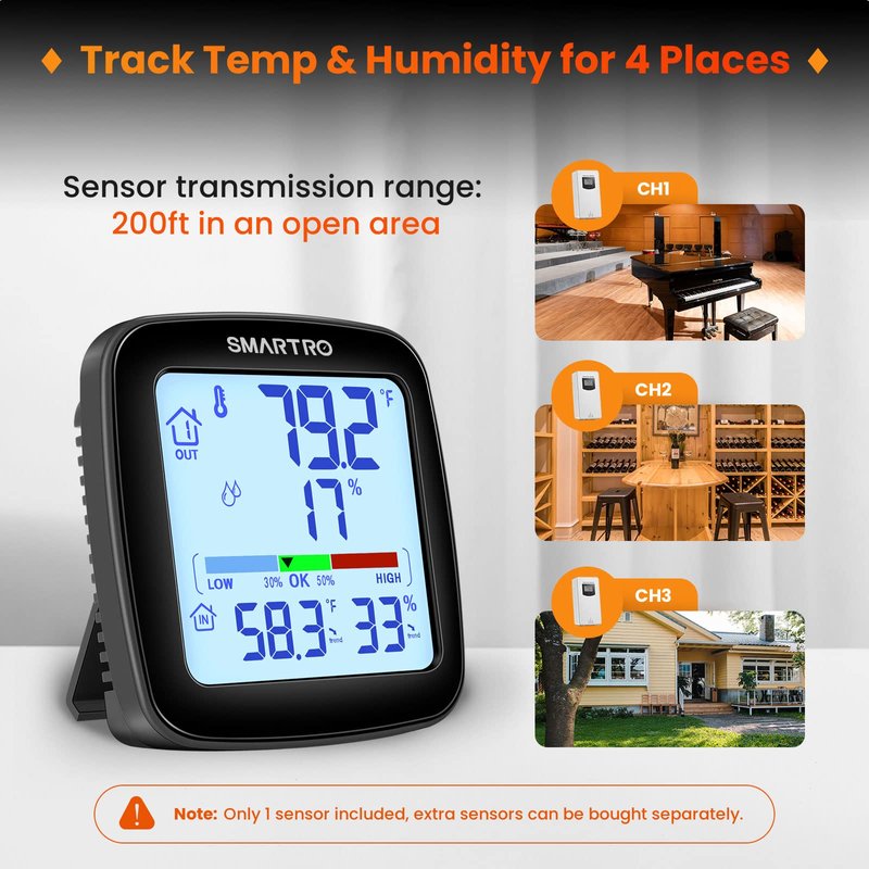 - ✨|| Connect up to 3 Wireless Sensors || Monitor your whole home, storeroom or greenhouse confidently with the hygrometer's wireless transmission capability. Add more sensors (only one included) and the digital thermometer can be connected to display readings from 4 places up to 200ft apart.