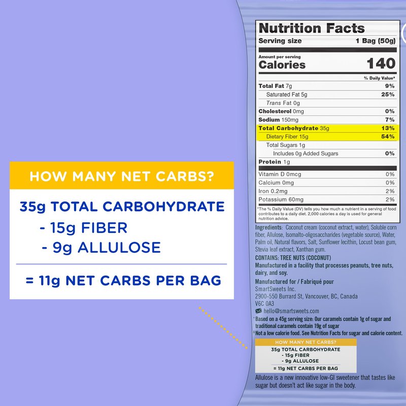 - KICK SUGAR: Feel good about candy with SmartSweets Caramel. Just 1g of sugar and 140 calories for the whole bag! Smartly sweetened with high-quality, natural sweeteners: stevia and allulose.