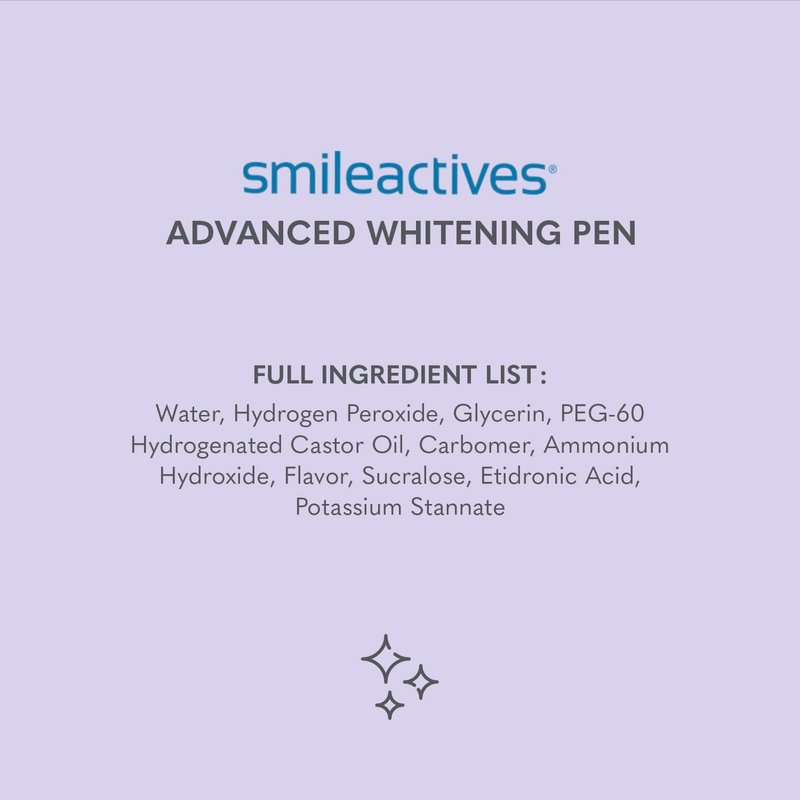 Fast, effective, super-convenient on-the-go teeth whitening. The Smileactives Advanced Teeth Whitening Pen provides a whitening boost that seeps into nooks & crannies, and its soft-bristle brush provides quick and easy, no-mess applications. Designed in a sleek, chic package for anytime use, you can use it after meals or in between meetings. Help freshen your breath while brightening your smile. Just brush onto teeth and go! Each pen lasts for up to three weeks and is enough for a full course of twice daily applications. You can see noticeable results in as little as 7 days. All Smileactives pens use hydrogen peroxide as opposed to carbamide peroxide used in other home teeth whitening products. After clinical trial, 100% of test participants reported having whiter teeth after 7 days. The Advanced Teeth Whitening Pen is a convenient lift to your regular brushing routine. You can be proud of brightening your smile with the Smileactives formulaβ free from alcohol, parabens, detergents, and artificial colors. All harsh substances that can be harmful.