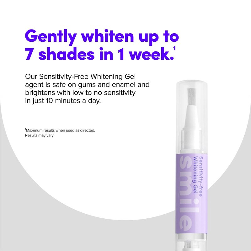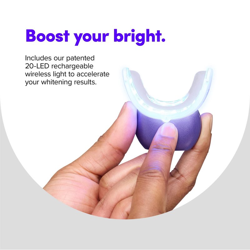 Say goodbye to tooth sensitivity and hello to your new favorite whitening kit. Our newest whitening innovation gives you a powerful yet gentle treatment to brighten your teeth up to 7 shades in just 1 week.¹ The Sensitivity-Free Whitening Gel features our ultra-gentle formula that is safe on gums and enamel, and our patented 20-LED rechargeable wireless light gives your treatment a boost. Finally, the Enamel Care Gel soothes and conditions your teeth for low to no sensitivity. In just 10 minutes a day, you’ll see a brighter smile after just 1 use.² If you’ve dealt with tooth sensitivity in the past, this is the whitening kit for you. ¹,² Maximum results when used as directed. Results may vary. ³Shade improvements observed vs. whitening without light.