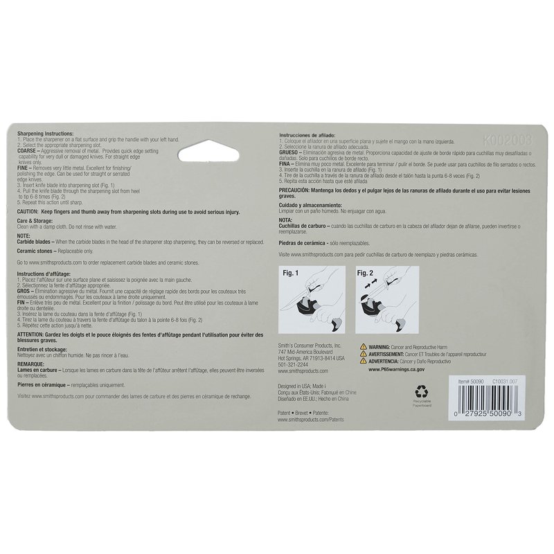 - 2-STAGE SHARPENER – This Smith’s sharpener features a carbide sharpener for dull and damaged straight-edge knives and ceramic rods for final edge honing. The ceramic stones can be used to lightly hone straight or serrated edge blades.